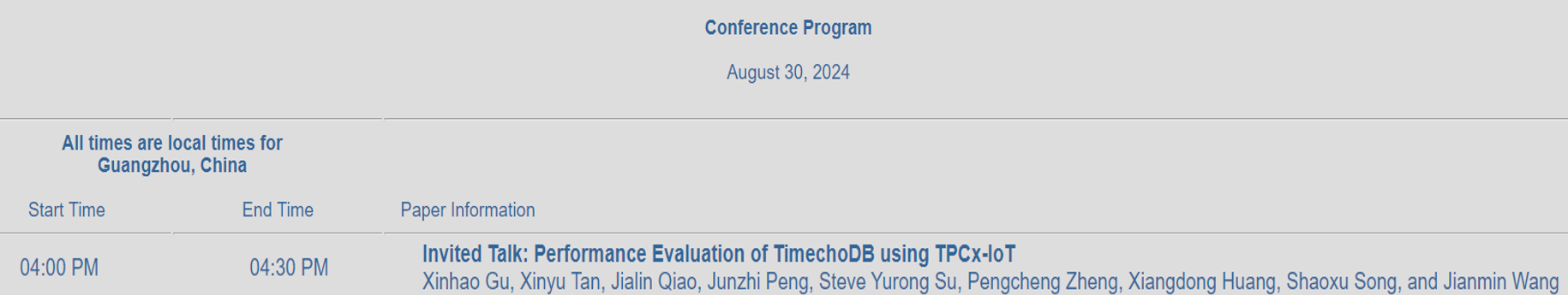 同时,在国际权威数据库性能测评基准组织事务处理性能委员会(TPC)主办的 TPCTC 2024 会议上,IoTDB 团队受主办方邀请,发表论文和做特邀报告,并组织讨论会。