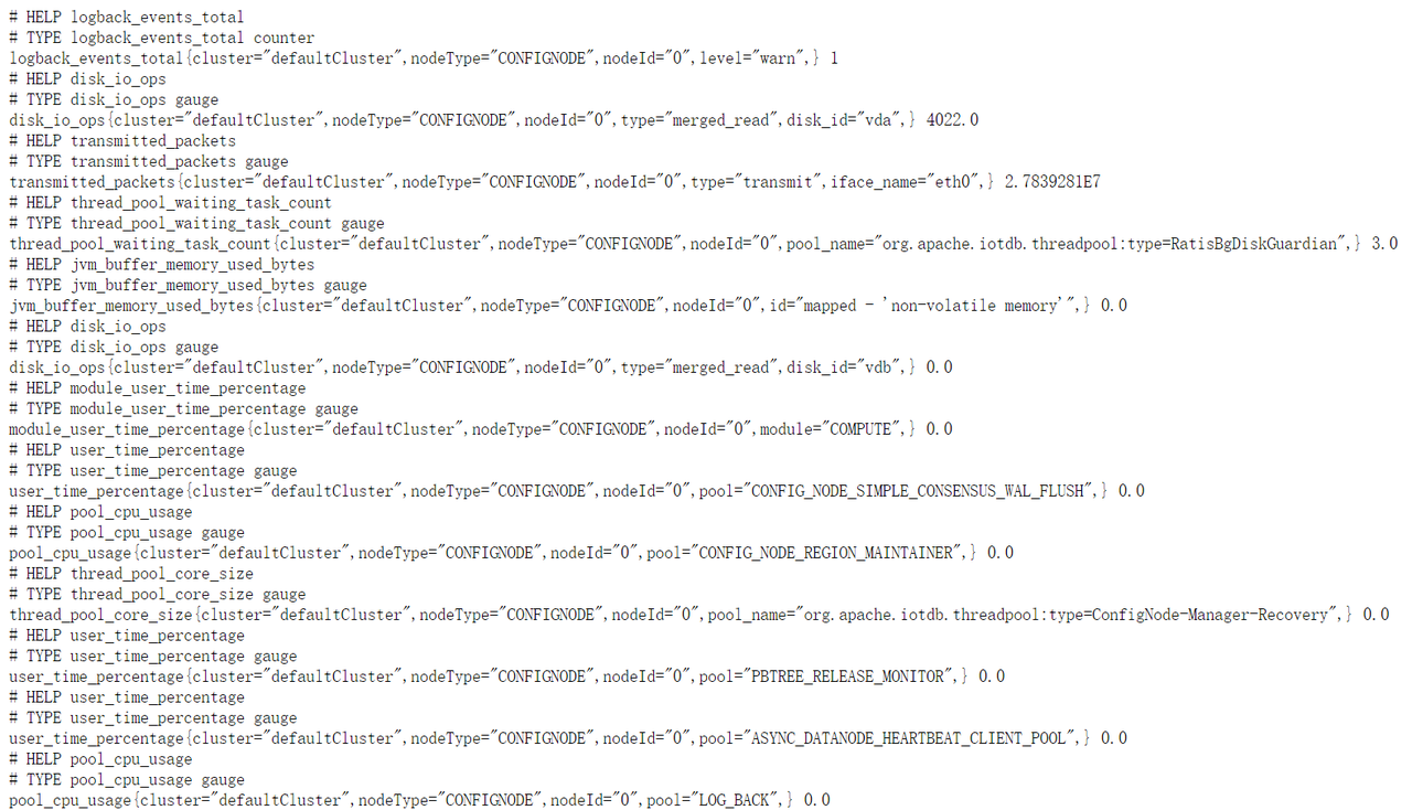192.168.1.3 | iotdb-1 | confignode | conf/iotdb-system.properties | cn_metric_reporter_list=PROMETHEUS cn_metric_level=IMPORTANT cn_metric_prometheus_reporter_port=9091 |