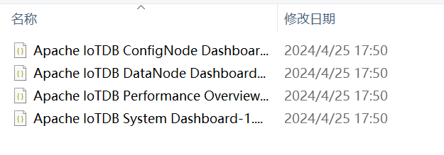 选择IoTDB监控面板中其中一个面板的json文件,这里以选择 Apache IoTDB ConfigNode Dashboard为例(监控面板安装包获取参见本文【安装准备】):