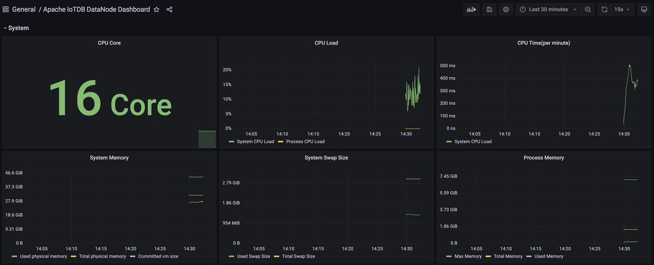 同样地,我们可以导入Apache IoTDB DataNode Dashboard、Apache Performance Overview Dashboard、Apache System Overview Dashboard,可看到如下的监控面板: