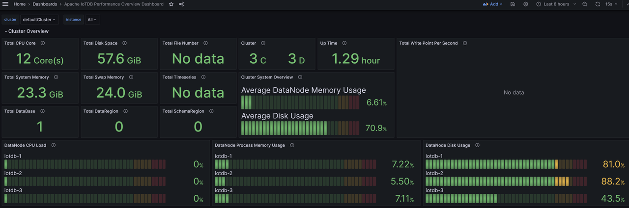 IoTDB配套监控面板是IoTDB企业版配套工具之一。它旨在解决IoTDB及其所在操作系统的监控问题,主要包括:操作系统资源监控、IoTDB性能监控,及上百项内核监控指标,从而帮助用户监控集群健康状态,并进行集群调优和运维。本文将以常见的3C3D集群(3个Confignode和3个Datanode)为例,为您介绍如何在IoTDB的实例中开启系统监控模块,并且使用Prometheus + Grafana的方式完成对系统监控指标的可视化。