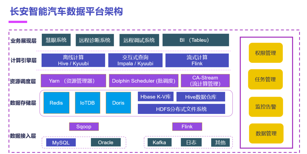 为实现智能化汽车建设,长安汽车构建了长安智能汽车数据平台,此大数据处理平台一共分为五层:数据接入层、数据存储层、资源调度层、计算引擎层、业务展现层。目前 IoTDB 主要用于数据存储层,以应对车联网海量时序数据的管理。