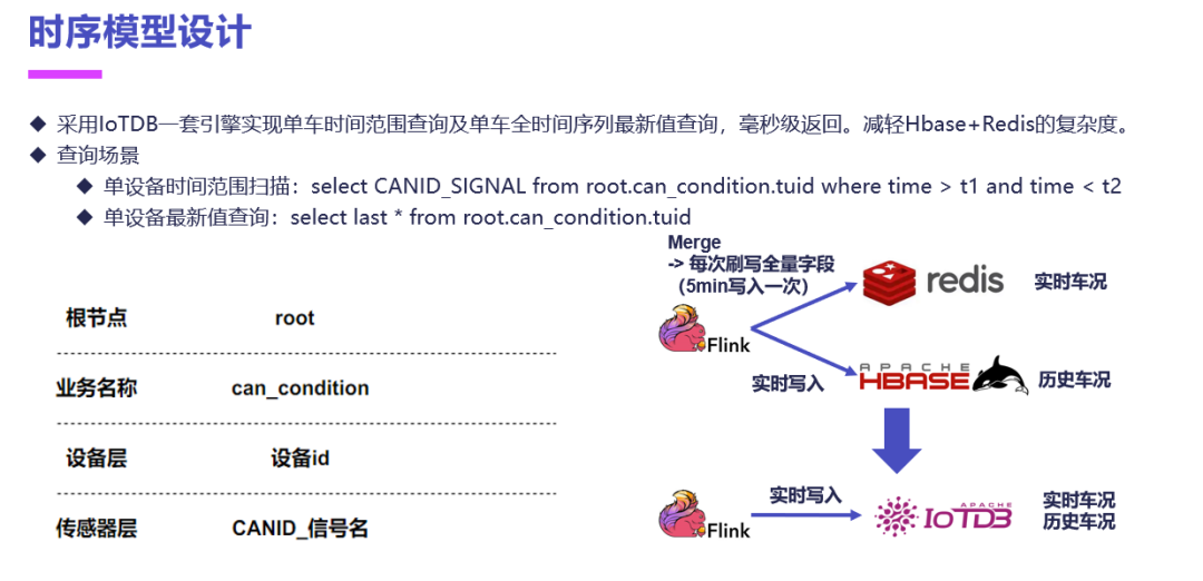 目前,在 IoTDB 的根节点、业务名称、设备层、传感器层的四级节点时序模型设计上,长安汽车的设备层采用 TBOX 的 TUID,即设备 ID 作为第三级节点;在传感器/测点层,除涵盖信号名,使用下划线连接 CANID 作为第四级节点。此存储结构的设计原因是可以方便的使用 IoTDB 支持的 select last * from root.CANID 命令查询,以便查询单车在某 CANID 下所有的数据值,进而让 IoTDB 同时实现长安汽车的主要查询场景:实时车况和历史车况的组合查询。